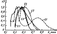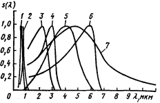 мм, на внутрішній частині поверхні якого нанесений фотокатод. Анодом служить металеве кільце, розташоване в центрі балона. Матеріал фотокатода визначає область спектральної чутливості фотоелемента. Характеристики відносної спектральної чутливості деяких фотокатодів наведені на рис. 4. Основні характеристики фотоелементів визначаються по впливу на них світлового потоку еталонного джерела
