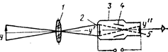 Електронно-оптичним перетворювачем (ЕОП) називається діючий на основі зовнішнього фотоефекту пристрій (рис. 4), яке оптичне зображення, що створюється об'єктивом на фотокатоді 2, перетворює у видиме зображення, що спостерігається на випромінюючому екрані (аноді) 5. ЕОП представляє персоною скляний балон 3, всередовищані якого розташована електростатична або магнітна система4, що фокусує електрони, емітовані фотокатодом. Оскільки число електронів пропорціональне локальний освітленості, що випускаються фотокатоду, то на екрані, покритому випромінюючим шаром, утвориться видиме зображення предмета. Спектральні характеристики фотокатодів ЕОП ті ж, що у фотоелементів і ФЕУ. Покриттями екранів служать дрібнозернисті люмінофор жовто-зеленого свічення для спостережень і фіолетово-синього свічення для фотографування. Час післясвітіння екранів різних типів складає