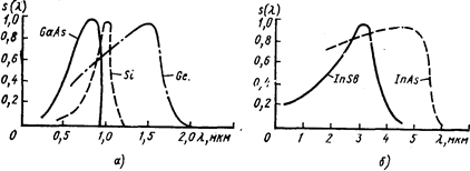 -переходу. Фотодіоди можуть працювати як з джерелом живлення (рис. 6, а) фотодіодний режим, так і без джерела живлення (рис. 6, б) - фотогальванічний режим. Спектральна чутливість фотодіодів (рис. 5) залежить від матеріалу чутливого шара: Ge, Si, GaAs, Se (фотодіоди, що не охолоджуються ), InSb, InAs, HgCdTe (фотодіоди, що охолоджуються ).