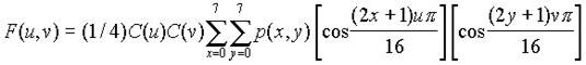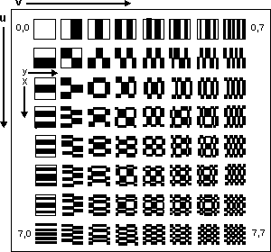 де v – горизонтальна координата графічного блоку, u – вертикальна, x – вертикальна координата усередині блоку, а у – горизонтальна координата усередині блоку, C(u), C(v)= 1/ для u, v = 0 і З(u), З(v)= 1 інакше. Два члени в квадратних дужках є ядрами перетворення, показаними нижче на рис. 2, а p (x, y) є піксельними даними блоку реального малюнка. Початок координат в обох випадках у верхньому лівому кутку. Процес кодування зводиться до розбиття зображення на блоки 8*8 пікселів і виконанню процедури двомірного DCT для кожного з цих блоків. Отримані коефіцієнти перетворення дискретизують. 64 числа, що характеризують рівень сигналу, перетворюються на 64 коефіцієнти перетворення (амплітуди просторових частот), які добре піддаються процедурі стискування. Діськретізатор округляє коефіцієнти, ця процедура вносить деякі помилки, але зворотне перетворення на приймаючій стороні за рахунок усереднювання частково усуває спотворення, що вносяться. На практиці дискретизатор реалізує декілька складніший алгоритм.