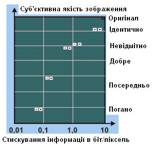 DCT забезпечує стискування на рівні 0.5–1.0 біт/піксель при хорошій якості зображення. Стискування вимагає часу, а максимально прийнятним часом затримки при пересилці зображення є 5 секунд. На мал. 3 приведена якісна оцінка чіткості і відповідності оригіналу зображення залежно від величини стискування (DCT). Якщо використовувати швидкість обміну 64 кбит/с, то ступені стискування 0,01 бита на піксель відповідатиме час передачі зображення 0,04 секунд, а стискуванню 10 – час передачі 40 сек.