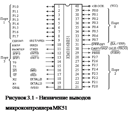 ОМЭВМ, назначение выводов которой представлено на рисунке 3.1 состоит из следующих основных функциональных узлов: блока управления, арифметико-логического устройства, блока таймеров/счетчиков, блока последовательного интерфейса и прерываний, .программного счетчика, памяти данных и памяти программ. Двусторонний обмен информацией между функциональными блоками осуществляется с помощью внутренней 8-разрядной магистрали данных. Разряды порта 3 микроконтроллера имеют двойную функцию, в зависимости от установленных режимов работы. Порт 3 может функционировать как обыкновенный параллельный 8-разрядный интерфейс, либо позволяет организовывать последовательный канал обмена данными и систему прерываний от внешних устройств, причём существует возможность задавать режим работы каждого разряда порта 3 в отдельности.