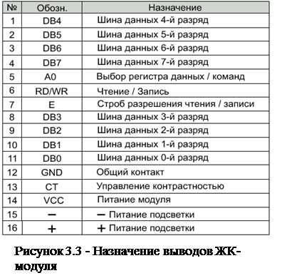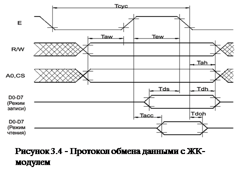 предусилительные схемы, ввиду наличия широкой номенклатуры изготавливаемых сенсоров, в том числе и со встроенными предусилителями сигнала. Схема устройства управления включает в себя систему сбора данных, построенную на одной микросхеме КР572ПВ4. Микросхема имеет 8 аналоговых входов и осуществляет последовательно преобразование по каждому из них. Аналоговый сигнал преобразуется в 8-значное двоичное число. Коэффициент нелинейности не более 0.3% Каждому аналоговому каналу соответствует ячейка оперативной памяти. Считывание данных может происходить асинхронно с получением результатов преобразования. Данный АЦП позволяет «оцифровывать» сигнал с напряжением до 2.5В. На полный цикл преобразования по всем восьми каналам требуется :не более 256 мкс, при тактовой частоте 2.5 Мгц. Ввиду того что в разрабатываемом устройстве нет необходимости в быстроте преобразования, скорость преобразования не имеет особого значения. Тактовым генератором для микросхемы сбора данных является таймер КР1008ВИ1. Для отображения информации применён ЖК-модуль MT-12S2-1 .(LCD) Данное индикаторное устройство позволяет отображать как цифровую так и символьную информацию. Размер экрана 2х12 символов при матрице символа 5х8. ЖК-модуль имеет встроенный контроллер управления экраном, аналогичный SED1520DOA фирмы SEIKOEPSON. Шина данных модуля имеет восемь разрядов. Назначение выводов ЖК-модуля (рисунок 3.3) и протокол обмена данными с ним показаны (рисунок 3.4) будут затронуты подробнее при разработке алгоритма программы.