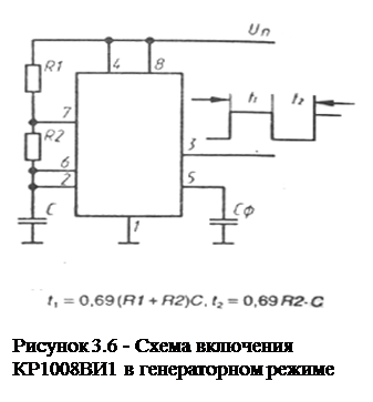 В устройстве управления использована возможность организации обработки прерывания от внешнего устройства для отсчёта секундных интервалов времени, что позволило сэкономить программную память и сосредоточить внимание программы на обработку показаний датчиков и работу с ЖК модулем. Для отсчёта секундных интервалов используется микросхема-таймер КР1008ВИ1 (рисунок 3.2), позволяющая задавать RC-цепочкой временные параметры генерируемого сигнала. Несмотря на отсутствие в схеме таймера кварцевого резонатора, RC-цепочка даёт стабильные колебания с достаточной для отсчёта времени процедуры точностью.