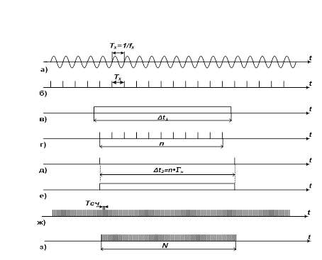 Таким образом, на входе 2 временного селектора 2 получаются вторые временные ворота длительностью Δt2 =nTx , через которые проходят счетные импульсы (ж). Попавшие в ворота импульсы подсчитываются счетчиком 2, на нем фиксируется их число N.