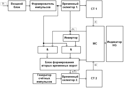 Фронт и срез образованных ворот синхронизированы с моментами появления импульсов периодической последовательности, сформированной из исследуемого сигнала, поэтому погрешность округления исключается. Вторые временные ворота заполняются счетными импульсами, число N которых фиксируется.