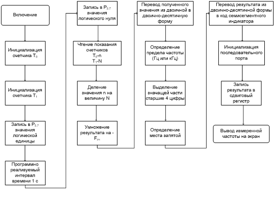 Количество импульсов подсчитанных импульсов n и N передается микроконтроллеру. В его памяти в виде константы хранится значение частоты счетных импульсов. На основе полученных данных микроконтроллер рассчитывает значение частоты измеряемого сигнала fx в соответствии с формулой (1). Далее микроконтроллер производит соответствующие преобразования с полученным результатом, приводя его значение к виду, доступному для восприятия семисегментным индикатором. Полученный результат выводится на экран.