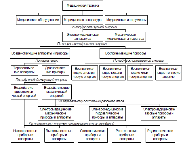Всю медицинскую технику можно разбить с точки зрения задачи, решаемой в медицинском технологическом процессе, на три большие группы: аппаратуру, инструменты и оборудование.