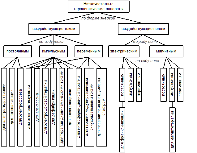 Низкочастотные терапевтические аппараты (рис. 2) делятся на две группы, в зависимости от формы воздействующей электрической энергии (ток, поле). Среди аппаратов, воздействующих током, можно выделить три группы соответственно виду тока (постоянный, переменный или импульсный). Дальнейшее деление этих аппаратов производится по функциональному признаку и включает в себя названия медицинских методик.