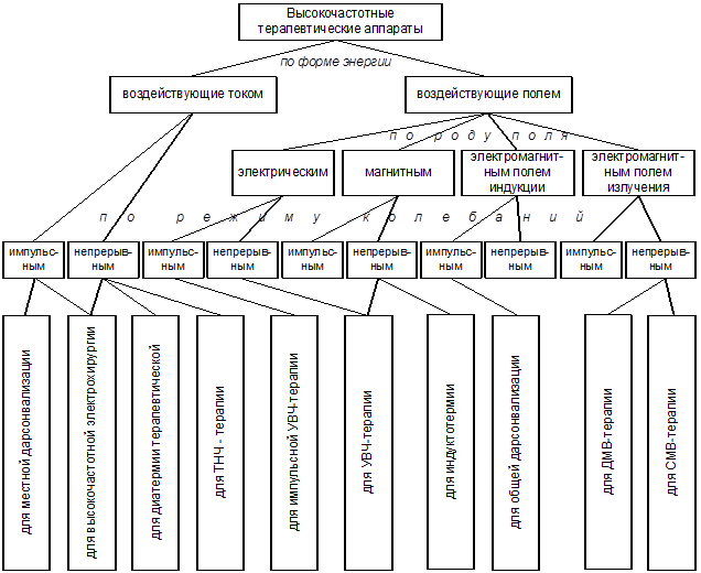 Высокочастотные терапевтические аппараты (рис. 3) составляют две группы в соответствии с формой используемой энергии (ток, поле). Аппараты, воздействующие полем, делятся на три группы в зависимости от используемой составляющей электромагнитного поля (электрическое, магнитное, электромагнитное). Дальнейшее деление аппаратов воздействующих как током, так и полем в зависимости от режима колебаний (непрерывный, импульсный). Заканчивается классификация высокочастотных терапевтических аппаратов конкретными медицинскими методиками.