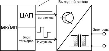 Развитие технологии электронной техники позволяет использовать микропроцессоры и микроконтроллеры для построения терапевтической аппаратуры (рис.7). Обычно имеется возможность управлять следующими параметрами выходных сигналов - длительностью, и скважностью, амплитудой и выходной мощностью и т.д. При помощи микропроцессорных средств управления можно задавать форму и тип импульсов (однополярный/биполярный), а также задавать длительность положительных и отрицательных импульсов. Для задания длительности сигналов в микропроцессорных системах используется блок таймеров, в то время как ЦАП (встроенный или внешний) задает огибающую. Далее сигнал поступает на выходной каскад для усиления. Выходной каскад также обеспечивает гальваническую развязку для защиты пациента в случае выхода прибора из строя.