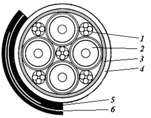 Рисунок 1.– Кабель КМБ-4: 1–симметричная четверка; 2–коаксиальная пара типа 2,6/9,5; 3–поясная изоляция; 4–свинцовая оболочка; 5–подушка; 6–две бронеленты.