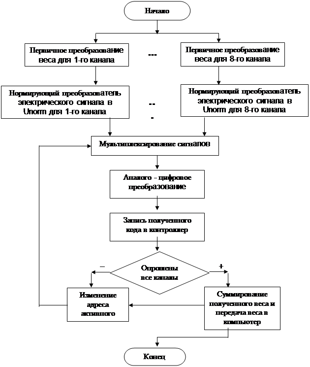На рисунке 1.2.1. изображена блок схема, поясняющая принцип работы схемы. Группа первичных преобразователей производит преобразование веса в соответствующие уровни напряжения. Далее нормирующие преобразователи формируют уровни напряжения Unorm для каждого канала в заданном диапазоне для того, чтобы напряжение было "удобным" для дальнейших с ним действий. Этот процесс происходит непрерывно и независимо от всех остальных.