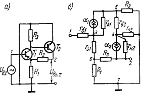 Рис. 4. Усилитель напряжения на двух транзисторах с равной проводимостью и его эквивалентная схема