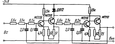 При сравнительно большом динамическом диапазоне и большой величине входного сигнала преимущество имеют фильтры, активный элемент которых построен на основе эмиттерного повторителя, ибо в других схемах выполнение этих требований достигается более сложным путем.