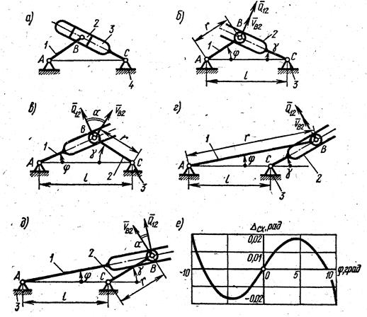Кулисные механизмы, изображенные на рис.2б, в, обеспечивают различные направления вращения ведущего и ведомого звеньев;
