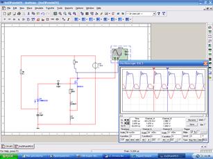 Из виртуальной осциллограммы рис.7 видно, что период импульсов Т=83нс их скважность S=2 (синяя осциллограмма). Красная осциллограмма является графиком напряжения на затворе транзистора и, следовательно, колебательного контура.