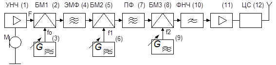 Звуковой сигнал с микрофона (М) усиливается усилителем низкой частоты (1) и попадает на балансный модулятор БМ1 (2). На второй вход БМ1 поступает напряжение с опорного генератора (3) с частотой f0 . Частота этого генератора стабилизирована кварцем. Значение частоты f0 определяется АЧХ электромеханического фильтра (ЭМФ) и выбором рабочей боковой полосы (верхней или нижней). На выходе первого балансного модулятора получается двухполосный сигнал с ослабленной несущей. Степень подавления несущей частоты на выходе передатчика (в антенне) определяется балансным модулятором и ЭМФ, а нежелательной боковой полосы – только параметрами ЭМФ. Последующие каскады не могут изменить степень подавления этих составляющих однополосного сигнала.