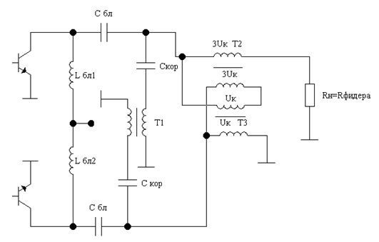 В данном случаем целесообразно оконечный каскад выполнить по двухтактной схеме, что позволяет при отдачи транзисторами мощности меньшей, чем стандартном напряжении питания повысить надежность устройства; а также при использовании данной схемы подавляются четные гармоники на 15-20 дБ, следовательно уменьшится порядок ФНЧ необходимого для подавления внеполосного излучения. Так как проектируемый каскад явлется широкополосным, то выберем в качестве схемы связи генератора с нагрузкой ТДЛ. В связи с падением коэффициента усиления по току β с увеличением частоты необходима цепь коррекции АЧХ.