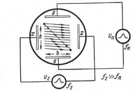 Процесс образования такой развертки состоит в следующем: на пару отклоняющих пластин подается пилообразное напряжение от генератора строчной частоты fz (рис. 2.2.1). Под действием этого напряжения электронный луч с постоянной скоростью перемещается слева направо (прямой ход строчной развертки) и затем быстро возвращается справа налево в исходное положение (обратный ход строчной развертки).