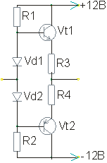 Полученное значение тока некритично к выбору типа транзистора. Поэтому в качестве активного элемента выберем согласованную пару транзисторов КТ315А, КТ361А. В качестве диодов смещения выберем диоды КД512А.