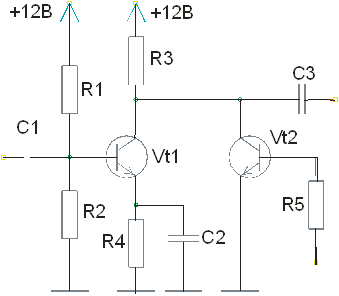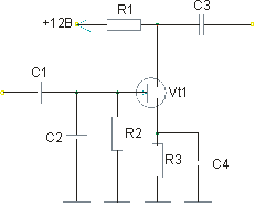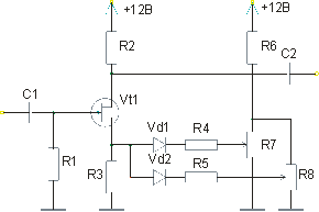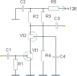 Данный усилитель представляет резисторный каскад, включенный по схеме с общим истоком [4]. Усилительным элементом является транзистор VT1. Транзистор VT2 задает начальный ток стока и следовательно, коэффициент усиления. Наиболее подходящими для данной схемы являются транзисторы КП313Б.