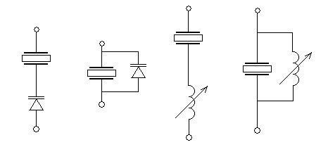 Четвертый вариант наихудший, так как параллельно кварцу стоит индуктивность, которая может определять генерируемую частоту. Первый и второй варианты имеют общий недостаток: сужается полоса, где кварц имеет индуктивный характер. Наиболее приемлем третий вариант, при котором понижается частота последовательного резонанса, но расширяется полоса, где кварц имеет индуктивное сопротивление. Для применений третьего варианта необходима управляемая индуктивность, которую легко реализовать, включив последовательно с варикапом индуктивность такой величины, чтобы суммарное сопротивление на частоте генерации носило индуктивный характер.