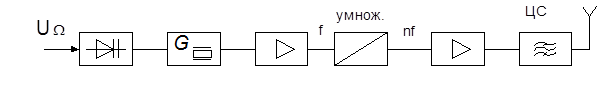 Модулирующее напряжение UW подается на варикап, с помощью которого модулируется по частоте кварцевый автогенератор (КГ). Кварцевый генератор работает на частотах 10–15 МГц, затем его частота умножается в n раз до рабочего значения, сигнал подается на усилитель мощности (УМ) и через цепь связи в антенну.