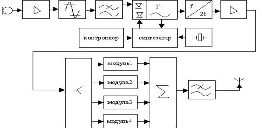 Промодулированный сигнал после ГУНа поступает на умножитель частоты (умножение в два раза), который переводит его в рабочий диапазон и, кроме этого, производит усиление. Далее сигнал усиливается в предварительных и предоконечном усилителях до уровня, необходимого для работы оконечного каскада. Оконечный каскад реализован в виде четырех идентичных модулей, выполненных по двухтактной схеме, причем схемы деления и сложения мощности от отдельных блоков, а также трансформации сопротивлений выполнены на отрезках длинных линий.