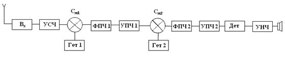 Сигнал, принятый антенной, через фидер поступает на вход приемника. Во входных цепях расположены фильтры, которые отсекают частоты не входящие в диапазон принимаемых част. Далее принятый и отфильтрованный сигнал поступает на вход усилителя сигнальной (радио-) частоты УСЧ, где происходит предварительное усиление на 43 dВ. Предварительно принятый и отфильтрованный сигнал поступает на сигнальный вход первого смесителя См1; на другой вход смесителя подается частота 116 МГц. формируя первую промежуточную частоту, равную 40 МГц.