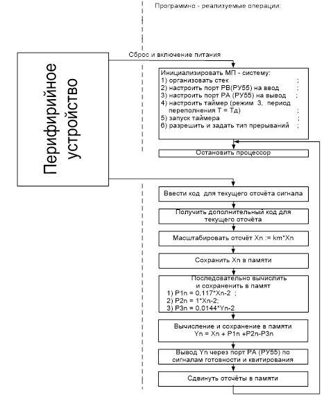 Последующие операции (ввод, вывод, преобразование кодов, оперативные обращения к памяти, арифметические преобразования) в каждом цикле работы фильтра выполняются под управлением рабочей программы фильтра.