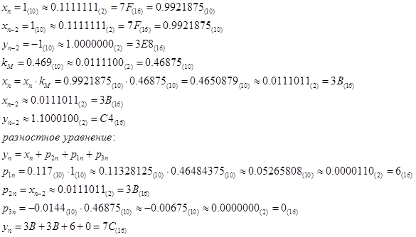 Реальные значения коэффициентов разностного уравнения и коэффициента kМ отличаются от заданных вследствие ограничения длины разрядной сетки: А2 = 1,117(10) » 1,00011101(2) = 1,113(10) ;