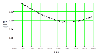 АЧХ и ФЧХ для заданных и реальных коэффициентов изображены на рис.2 и рис.3 соответственно (пунктиром показаны реальные зависимости). По графикам видно, что реальные и заданные характеристики практически не отличаются.