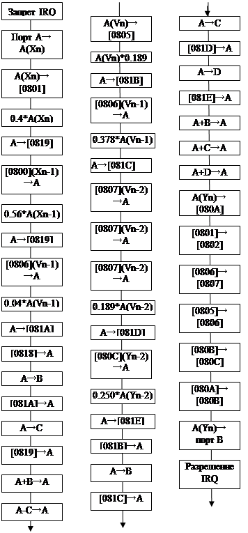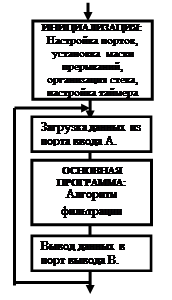 По переднему фронту импульса на линии STBA формируется сигнал BF (PC1) "буфер полон" который используется в качестве сигнала квитирования. По заднему фронту импульса STBA формируется сигнал INTR (PC0) который является сигналом прерывания. С приходом сигнала запроса прерывания RST 7,5 процессор переходит в режим обслуживания прерываний. Соответственно программе обслуживания прерываний 7,5 производится считывание данных из порта ввода А.Затем процессор начинает выполнение основной программы. Основная программа, содержащая в себе алгоритм фильтрации производит операции над выборками, поступающих с внешнего устройства на порт ввода, в соответствии с заданным алгоритмом. По окончанию вычислений процессор выдаёт данные в порт вывода В. И процесс повторяется вновь.