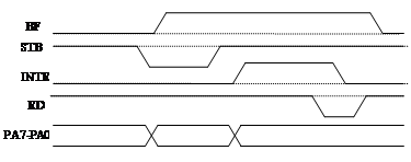 По переднему фронту импульса на линии STBA формируется сигнал BF (PC1) "буфер полон" который используется в качестве сигнала квитирования. По заднему фронту импульса STBA формируется сигнал INTR (PC0) который является сигналом прерывания.