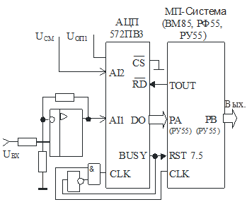 Ввод данных в МП целесообразно осуществлять по сигналу готовности АЦП, используя для этого прерывание МП оповещающим сигналом /BUSY. Выберем аппаратное прерывание динамического типа - RST7.5, которое разрешается при установке маски прерывания командой SIM. Для ввода данных определим порт РA (РУ55) в режиме простого ввода без квитирования.
