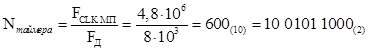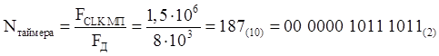 Частота дискретизации FД = 8 кГц формируется аппаратным таймером РУ55, в котором частота переполнения FП в режиме 3 равна FД . При использовании в качестве входных импульсов таймера тактовых импульсов CLKМП-системы (FCLK МП = 1,5 МГц) исходное состояние таймера равно