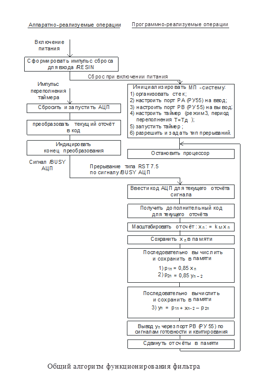 По заданию требуется спроектировать цифровое фазовое звено, используя набор К1821, включающий микропроцессор ВМ85, ПЗУ и порты на микросхеме РФ55, ОЗУ, таймер счетчик и порты на микросхеме РУ55. Входной сигнал аналоговый, оцифровывается с помощью 8 - разрядного АЦП КР572ПВ3, после чего имеет вид отсчетов, следующих через интервал дискретизации. После обработки сигнал в дополнительном цифровом коде должен передаваться в порт ввода-вывода по алгоритму с квитированием. Частота дискретизации FД = 8 кГц, разрядность выходного сигнала 8. Обработка должна происходить в реальном масштабе времени. При проектировании следует придерживаться двух критериев: минимальная аппаратная конфигурация устройства и минимальное время операций обработки сигнала (вычисления). При определенных условиях эти критерии противоречат друг другу.