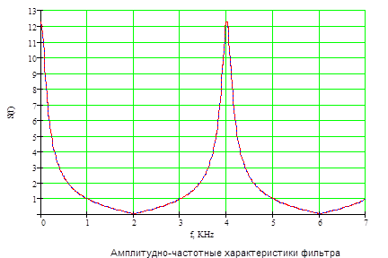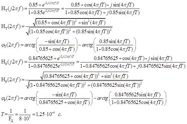 При z= ej w T = ej2 p fT , где Т = ТД = 1/FД (FД = 8 кГц) сигнал на входе фильтра - синусоида с частотой fи с единичной амплитудой, а функция H (ej2 p fT ) равна частотной характеристике фильтра, из которой можно получить АЧХ и ФЧХ.