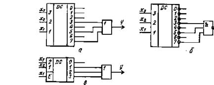 , представлену в ДДНФ, можна реалізувати за допомогою трьох входового дешифратора з прямими (рис. 1.2, а) чи інверсними (рис. 1.2, б) виходами.