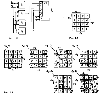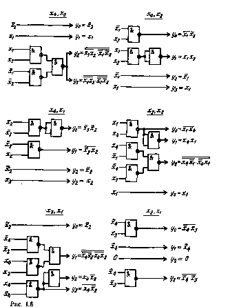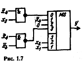 На рис. 1.5 показані всі шість варіантів визначення залишкових функцій. Виключає перемінні зазначені біля діаграм для кожного варіанта. Схеми на елементах І-НІ, що відповідають кожному варіанту, представлені на рис. 1.6. Найбільш проста реалізація заданої функції є при виключенні за допомогою мультиплексора перемінних х1 і х2 (рис. 1.7).