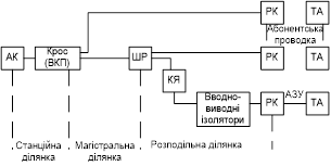 - абонентська проводка: від розподільної коробки (РК) до розетки включення кінцевого абонентського телефонного пристрою.