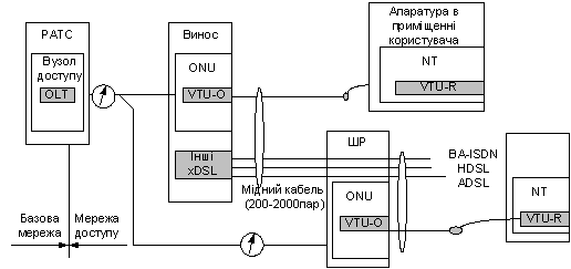 Устаткування в приміщенні користувача (Customer Premises) підключається з використанням мережних закінчень (NT), що містить передавальні модулі VDSL на вилученій стороні (VTU-R) c Оптичним мережним модулем (ONU) по АЛ. ONU, що можуть містити трохи VTU-C (кілька портів), підключаються до OLT по ВОЛС. Таким чином, у відповідності зі структурою рис.1.2, OLT може бути представлений як ЦКУ а ONU як мультіплексоры доступу. ONU можуть бути розміщені в приміщенні РАТС, у ШР (Cabinet), у РК.