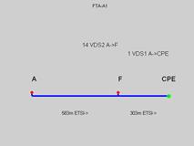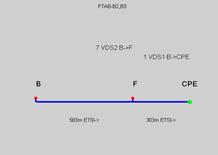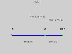 Тепер розглянемо варіант FTAB, ONU розташовуються в точках А і В. Таким чином ми маємо можливості підключення абонентів В1 , В2 , В3 , С1 . Довжина абонентської лінії для цих абонентiв не перевищує 1500 м. Розглянемо ділянку В – СРЕ, B – F – CPE i B – C – CPE. Дiлянку А – В не розглядаємо тому, що мiж цими ONU прокладається оптичний кабель, тобто А-В являє собою магістральну дiлянку (не має взаємних впливів).