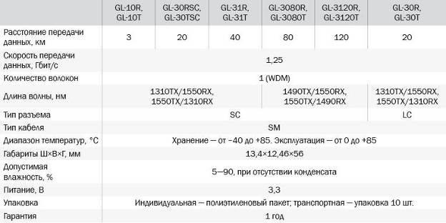 Характеристики трансиверов Mini GBIC (SFP) WDM