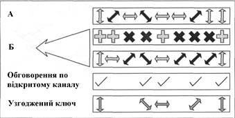 3. Після прийому абонентом Б послідовності біт і відкидання невизначених позицій залишається N свідомо певних позицій, які й приймаються за "чорновий варіант" ключа.