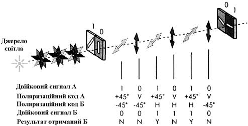 Для кодування стану "0" абонент А може використати лінійну поляризацію 90° (V), а для "1" – діагональну лінійну поляризацію, повернену на кут 45° [див. рис.2].