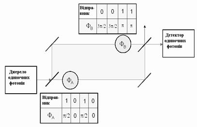 Тут передбачається, що відправник і одержувач використовують фазові зрушення (FA, FB) = (0, 3p/2) для нульових біт і (FA, FB) = (p/2, p) для одиничних бітів (для алгоритму ВВ84 використовуються інші припущення).