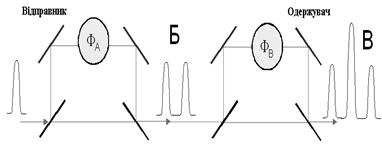 Але на виході інтерферометра одержувача вона можлива (В). Вірогідність того, що фотонні амплітуди складуться (центральний пік вихідного сигналу інтерферометра В) дорівнює