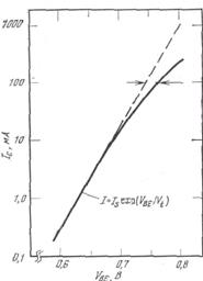 Рис. 6. Зависимость коллекторного тока от напряжения база - эмиттер, иллюстрирующая отклонение от идеальной характеристики при больших токах.